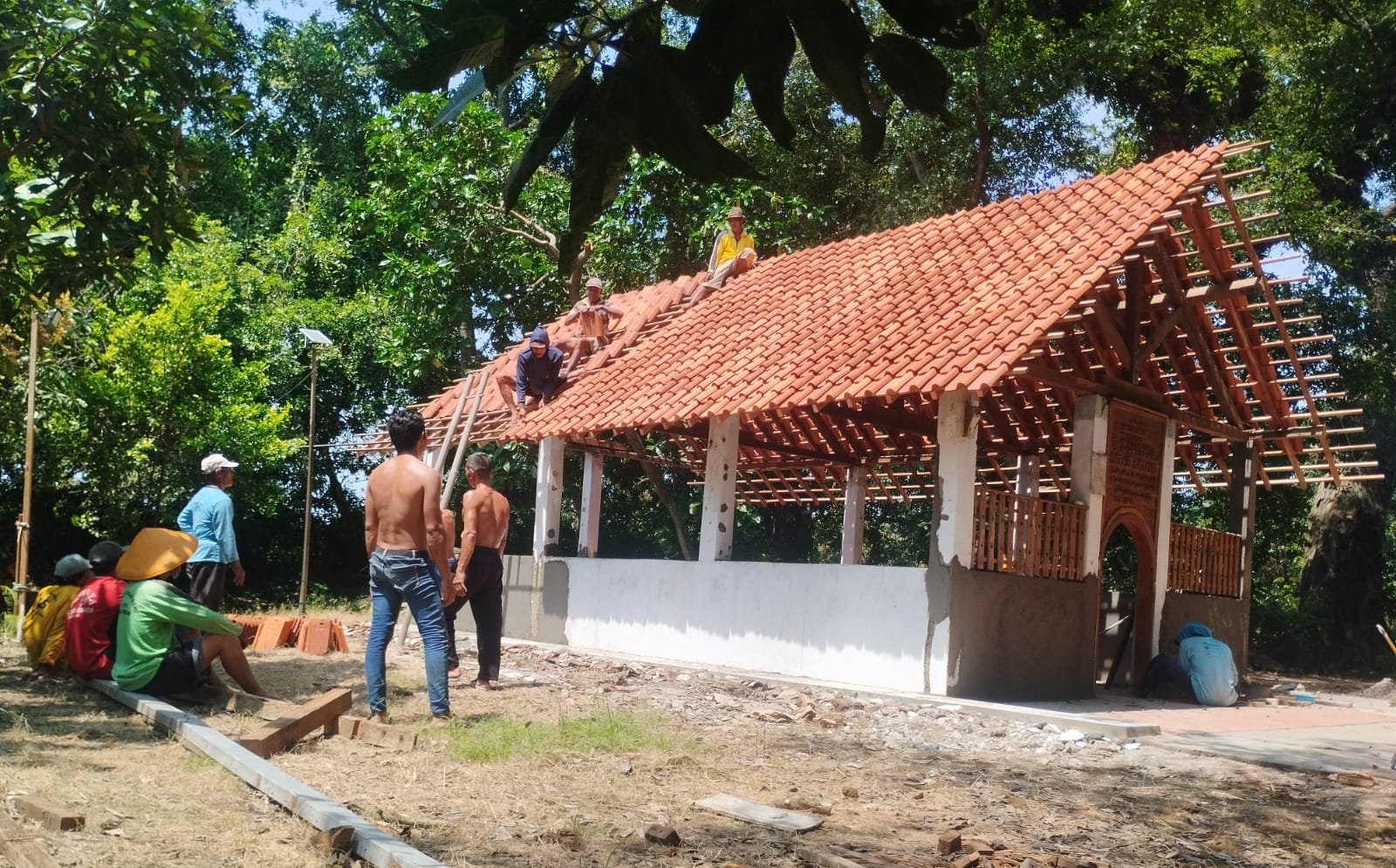 Sebagian warga berada di bagian bawah bangunan untuk menyiapkan dan mengangkat material, sementara yang lainnya naik ke rangka atap untuk menyusun genteng dengan hati-hati agar pemasangan berjalan baik dan tahan lama.