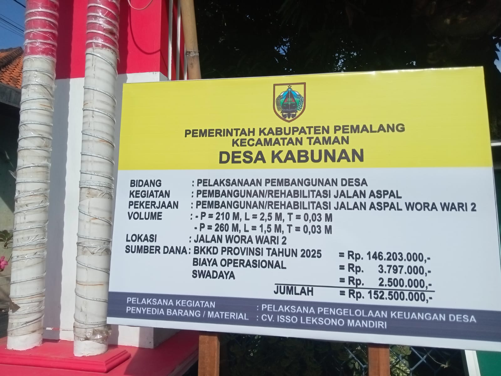 Penyedia barang dan material : CV. ISSO LEKSONO MANDIRI, yang telah ditunjuk melalui mekanisme Banprov. “Kami ingin mempercepat akses warga dan memastikan mobilitas hasil pertanian lebih lancar,” ujarnya