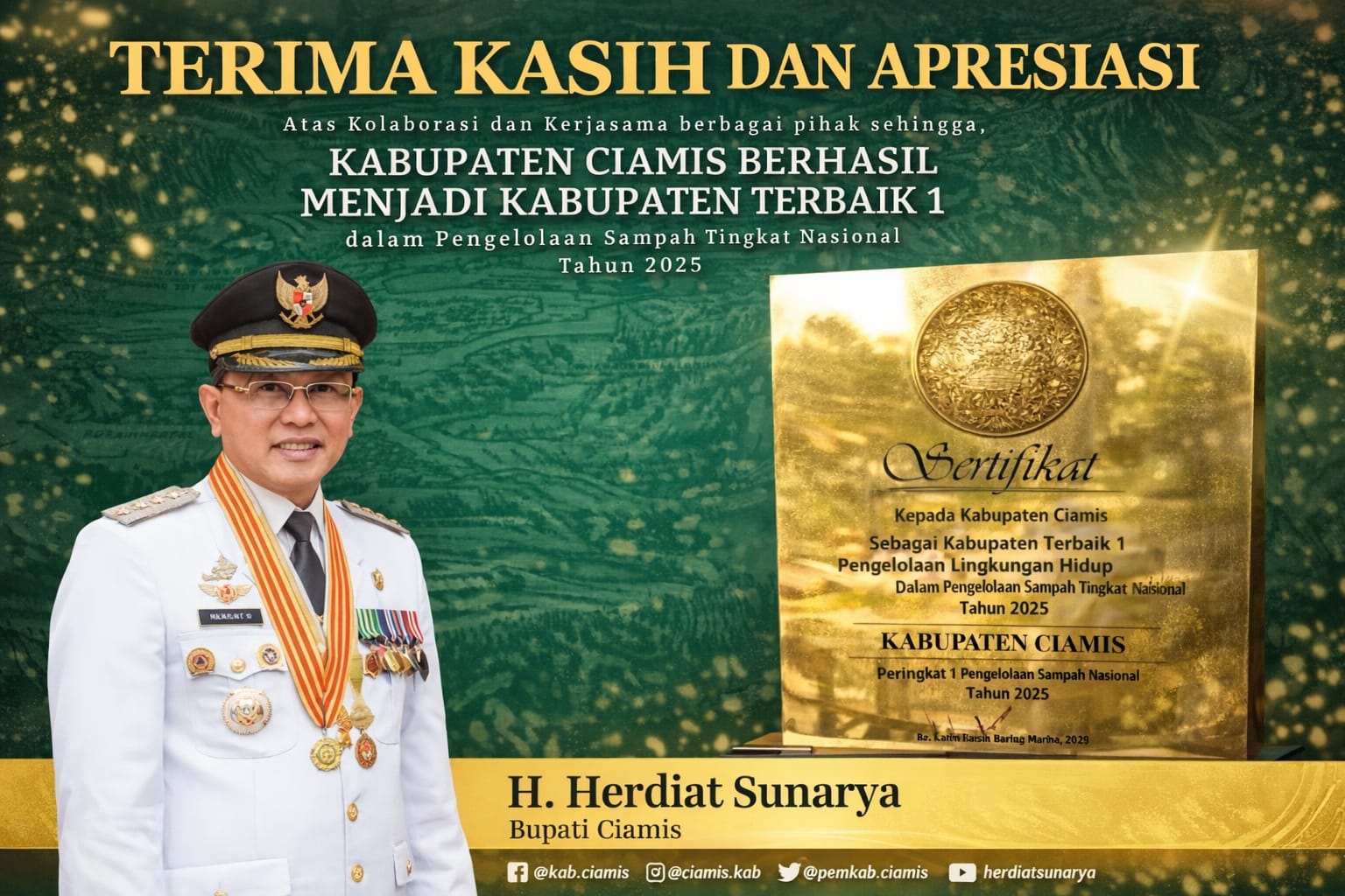 “Terima kasih dan apresiasi atas kolaborasi serta kerja sama berbagai pihak sehingga Kabupaten Ciamis berhasil menjadi Kabupaten Terbaik I dalam Pengelolaan Sampah Tingkat Nasional Tahun 2025,” ujar Herdiat.