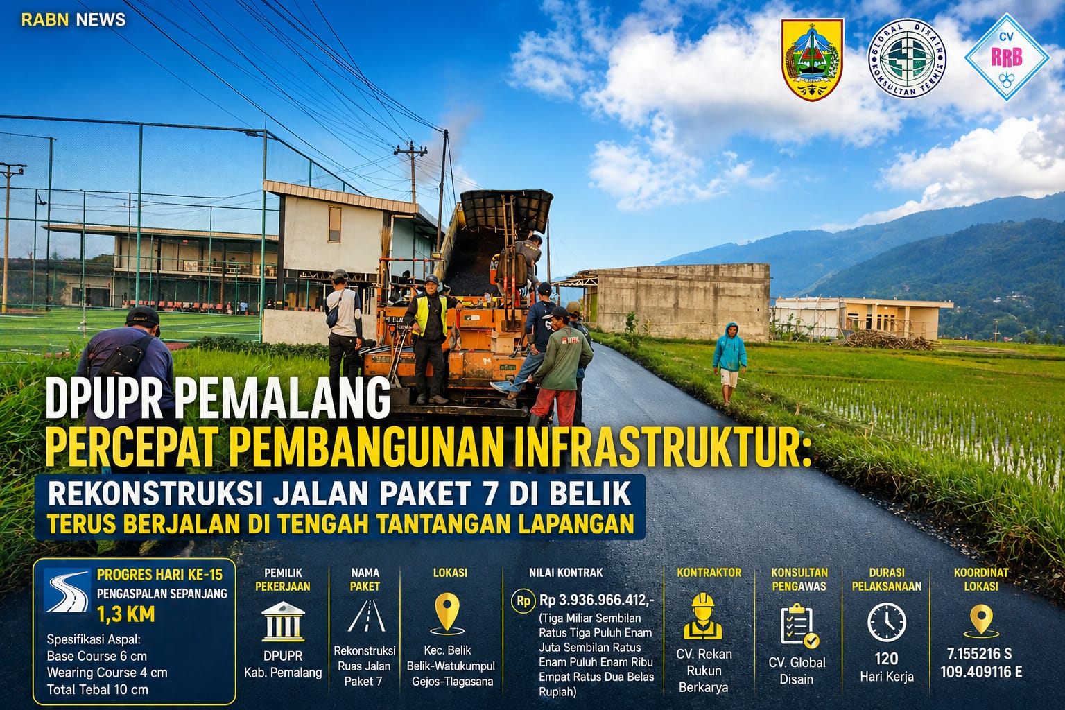 RABN.CO.ID, PEMALANG – 26 April 2026 — Pemerintah Kabupaten Pemalang melalui Dinas Pekerjaan Umum dan Penataan Ruang (DPUPR) menegaskan komitmennya dalam mempercepat pembangunan infrastruktur guna memperkuat konektivitas antarwilayah. Salah satu langkah strategis tersebut diwujudkan melalui pelaksanaan Rekonstruksi Ruas Jalan Paket 7 di Kecamatan Belik yang menghubungkan jalur Belik–Watukumpul serta Gejos–Tlagasana.