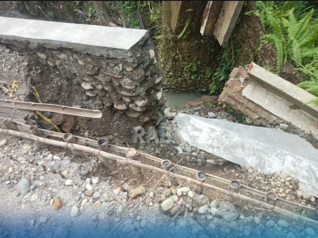 Badan jembatan terlihat ambruk tergerus air hujan, memicu dugaan kuat bahwa pekerjaan konstruksi tidak sesuai dengan Rencana Anggaran Biaya (RAB).