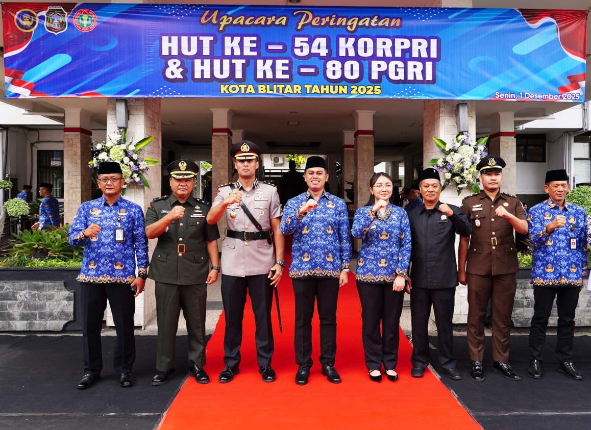 RABN.CO.ID, BLITAR – kepala Staf Kodim 0808/Blitar Mayor Inf Imam Suyoso menghadiri Upacara Peringatan HUT Korp Pegawai Republik Indonesia (Korpri) ke- 54 dan HUT PGRI ke 80 Tahun 2025 di Halaman Kantor Walikota Blitar, Senin (1/12/2025).