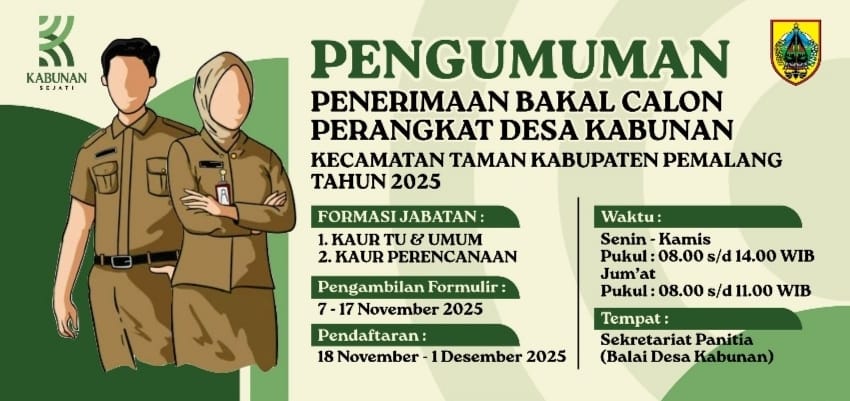 RABN.CO.ID, PEMALANG – Pemerintah Desa Kabunan, Kecamatan Taman, Kabupaten Pemalang, membuka penerimaan perangkat desa tahun ini dengan kebijakan yang terintegritas,dan menarik perhatian publik. Untuk sekian kalinya, seleksi perangkat desa dibuka bagi seluruh warga negara Indonesia (WNI), sebagaimana diatur dalam Undang-Undang Nomor 6 Tahun 2014 tentang Desa,tanpa dibatasi domisili di wilayah desa setempat.Selasa (11/11/2025)
