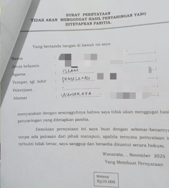 RABN.CO.ID, PEMALANG – Panitia Seleksi (Pansel) calon perangkat Desa Wanarata, Kecamatan Bantarbolang, Kabupaten Pemalang, resmi membatalkan penggunaan surat pernyataan “tidak akan menggugat” dalam proses rekrutmen perangkat desa. Keputusan ini diambil setelah surat tersebut dinilai bertentangan dengan prinsip hukum dan hak konstitusional peserta. (3/12/2025)