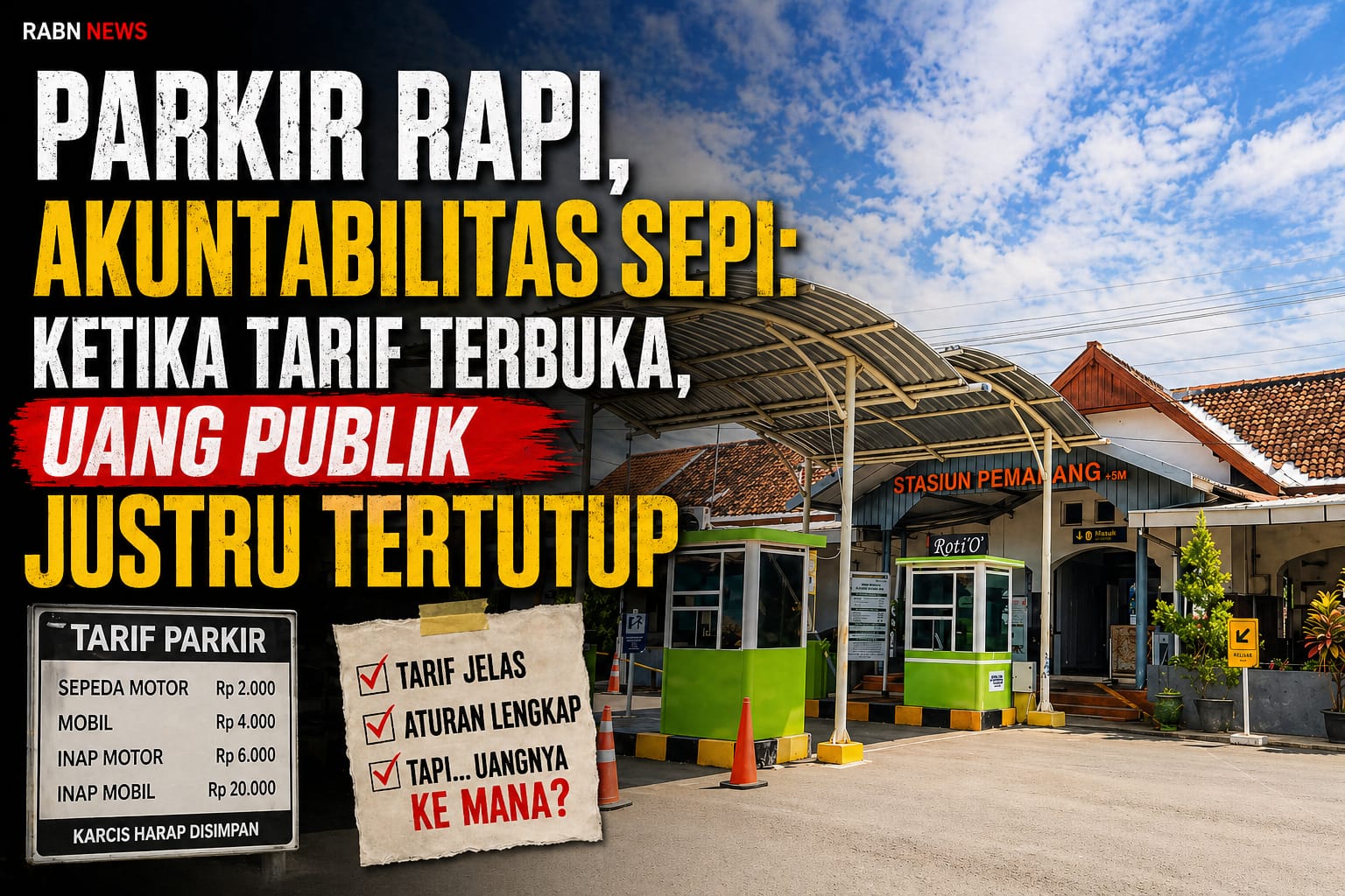 RABN.CO.ID, PEMALANG – Angkanya terang, tulisannya tegas, tarifnya terpampang tanpa malu: motor Rp2.000, mobil Rp4.000, inap hingga Rp20.000. Semua terlihat tertib, seolah tak menyisakan ruang untuk curiga. Tapi justru di balik kerapian itu, publik mulai bertanya—dengan nada yang kian meninggi: setelah kami bayar, uangnya ke mana?