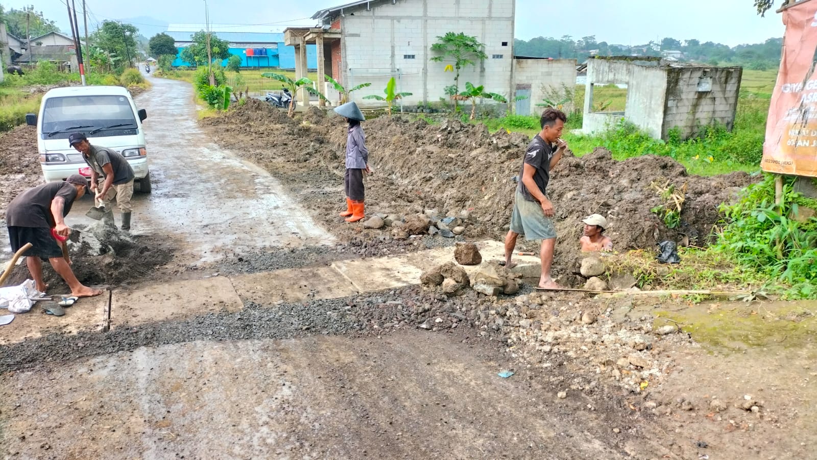 Selama proses pekerjaan berlangsung, kondisi cuaca di lokasi sempat berubah. Hujan turun ketika pekerjaan belum sepenuhnya selesai, sehingga air sempat menggenang di permukaan jalan. Situasi tersebut berpotensi mengganggu arus kendaraan yang melintas di jalur tersebut.