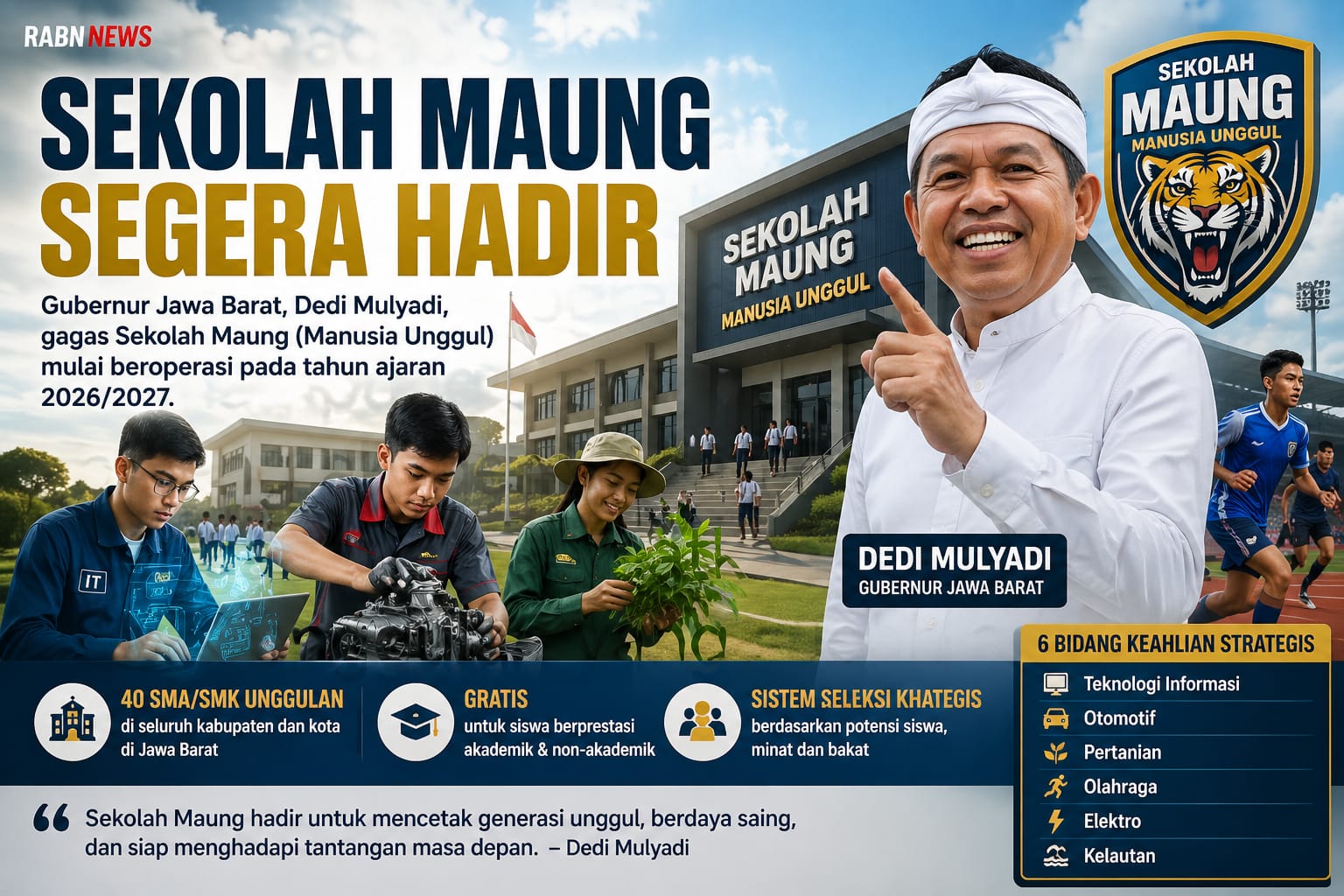 RABN.CO.ID, BANDUNG – 27 April 2026 — Pemerintah Provinsi Jawa Barat di bawah kepemimpinan Gubernur Dedi Mulyadi menegaskan komitmennya dalam memperkuat kualitas sumber daya manusia melalui peluncuran program Sekolah Maung (Manusia Unggul). Inisiatif ini diproyeksikan mulai beroperasi pada tahun ajaran 2026/2027 dan menjadi salah satu pilar utama transformasi pendidikan berbasis potensi dan kebutuhan masa depan.