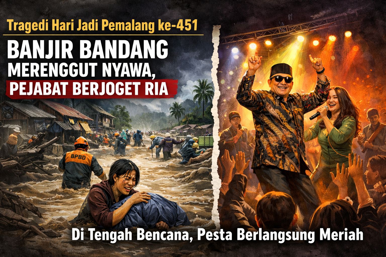 Peringatan Hari Jadi Pemalang ke-451 yang semestinya berlangsung khidmat justru berubah menjadi ironi pahit. Saat banjir bandang disertai angin kencang menerjang wilayah Pemalang bagian selatan dan merenggut nyawa seorang warga, di waktu yang hampir bersamaan panggung hiburan perayaan tetap berlangsung meriah.