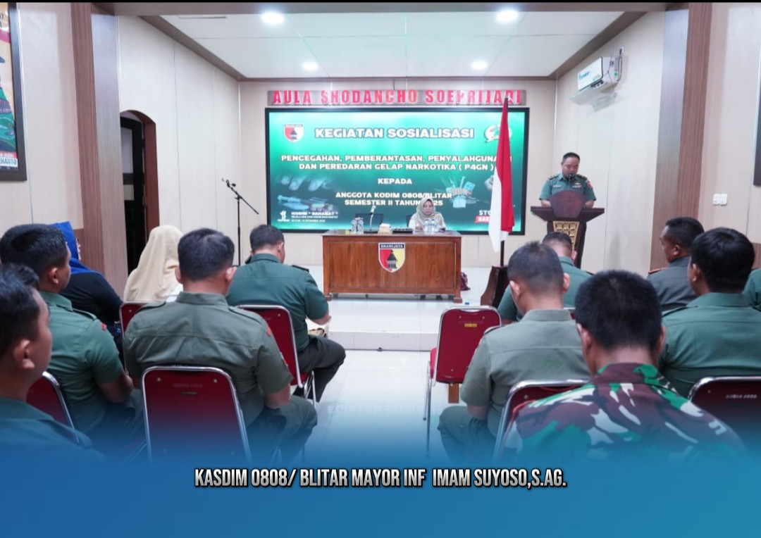 RABN.CO.ID, BLITAR – Kodim 0808/Blitar menggelar kegiatan Sosialisasi Pencegahan, Pemberantasan, Penyalahgunaan dan Peredaran Gelap Narkotika (P4GN) Semester II Tahun 2025, Rabu (10/12/2025), bertempat di Aula Shodancho Soeprijadi. Kegiatan yang berlangsung ini diikuti sekitar 100 peserta, terdiri dari prajurit TNI dan ASN Kodim 0808/Blitar.